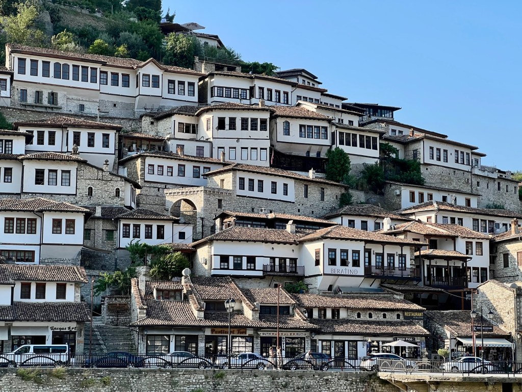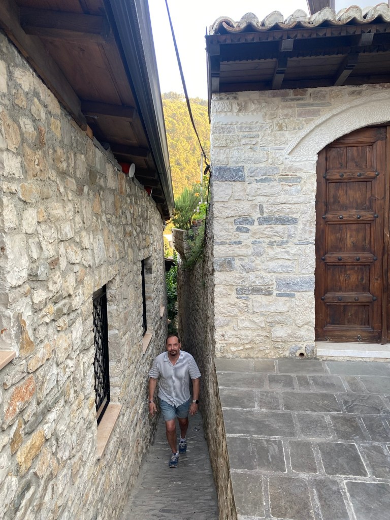 Sitten lähdimme ajelemaan kohti Sarandaa tai Sarandëa. Molempia kirjoitusasuja näkee täällä. Matka kesti noin tunnin, tie oli erinomasessa kunnossa ja leveä kaistainen. Maisemat olivat kertakaikkiaan huikeat. Toinen toistaan korkeampaa vuorta tuli näkyviin ja oli aivan vihreää. Ei tarvinnut silti ajella serpentiiniteitä, vaan ajelimme laaksossa. Yksi yli kilometrin pituinen tunnelikin oli.