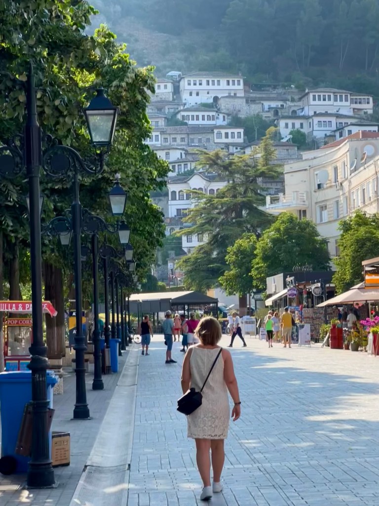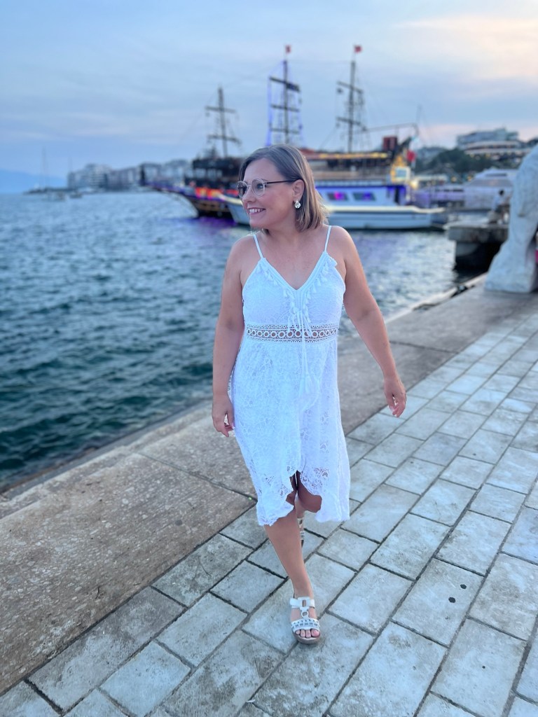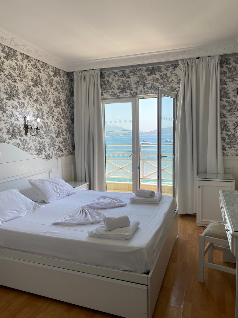 Hotelli oli oikein nätti ja rantabulevardin varrella. Tämä Saranda on The turistipaikka täällä ja kovasti nouseva kohde eurooppalaisille turisteille. Suomestakin tehdään jo tänne pakettimatkoja. Aika pieni ranta kuitenkin oli, kapea ja pikkukivinen. Sen tiesinkin että täällä ei ole hiekkarantaa ja olimme varustautuneet uimakengillä. Ne tulikin tarpeeseen. Sitä en tiennyt että rannalla ei ollut ollenkaan rantatuoleja eikä auringonvarjoja. Molemmat olisivat olleet tarpeen. Ehkä varsinaisena sesonkiaikana eli heinä-elokuussa täällä on rantatuolit. Ei siinä kuumilla kivillä ollut hääviä maata, vähän molempia ärsytti ja koko Sarande oli vaan hotelleja täynnä oleva turistikylä. Voi hitsi miksi ei jääty sinne ihanaan Gjirokastëriin. Eipä voi ikinä tietää etukäteen mitkä paikat on parhaita itselle. Sen mekon sain käyttöön saman tien ja olihan se ihan sopiva.