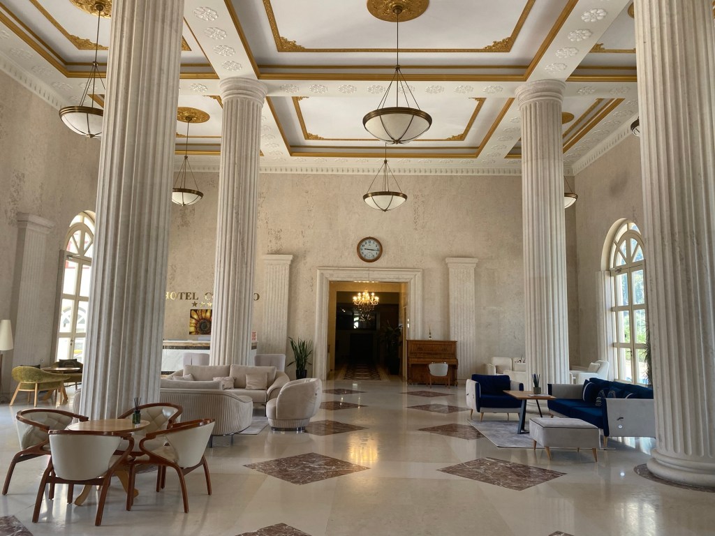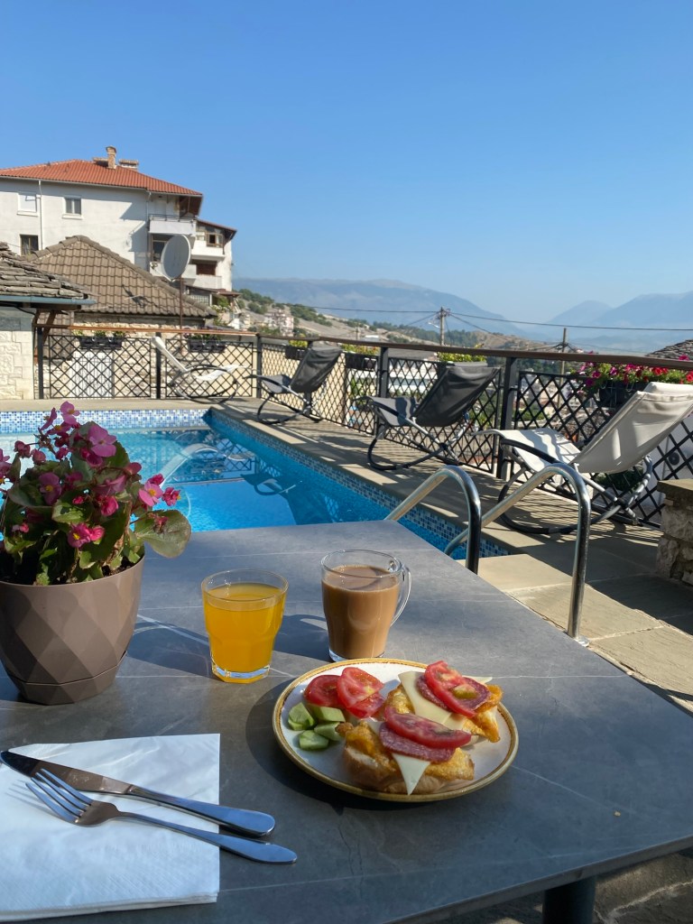 Heräsin kukon kiekunan aikaan ja ihan kirjaimellisesti. Hotellimme lähellä oli kanoja ja kukko tai useampiakin. Yöllä myös koirat haukkuivat ja heräsin siihenkin. Ei siis parhaimpia öitä täällä. Aamu oli kuitenkin ihana ja kirjoittelin blogia parvekkeella. Aamupala oli yllättävän monipuolinen ja syödä sai myös ulkona. Ei ollut kiire, sillä olimme jo vartin yli kasi syömässä.