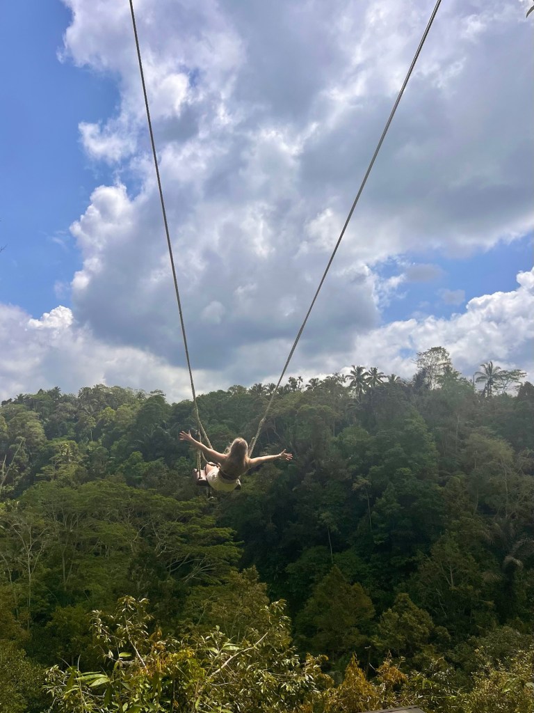 Matka Leke Leke -vesiputoukselle kesti melkein kaksi tuntia, mutta oli kyllä sen väärtti. Kyseinen paikka ei ole vielä mahdottoman tunnettu ja vähän kauempana Ubudista ja ehkä sen takia aika rauhallinen. Putoukselle oli noin vartin kävelymatka parkkipaikalta ja sen varrella oli mahdollisuus mennä Bali-keinuun. Ei minulle sopiva juttu, mutta Minealle kyllä! Aika hurjaltahan se näytti, mutta ihan turvallista kuitenkin. Vyötäröllä oli varmistushihna ja selän takana ekstrahihna johon voi nojata.