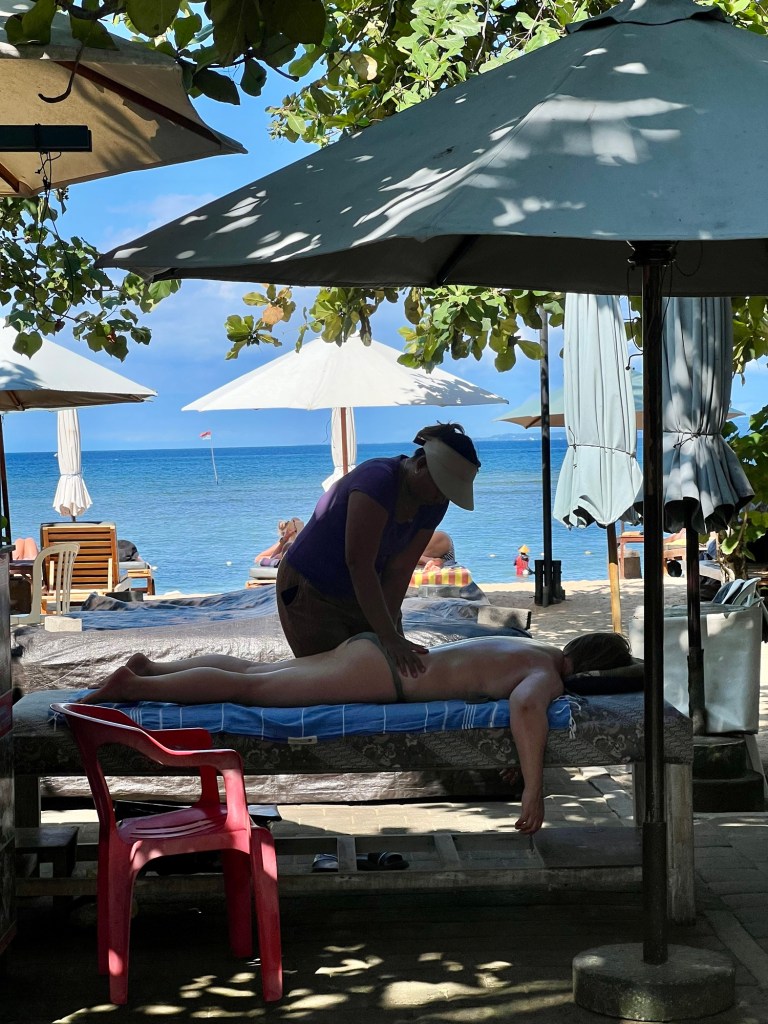 Rannalta oli palvelut hyvät, saimme heti aurinkotuolit muutaman euron hintaan per kappale ja kylmälaukusta myytin juomia suoraan rantapedille. Hierontapalveluja oli tarjolla myös ja otin puolen tunnin niska-hartia-selkähieronnan balilaiseen tyyliin. Oli tosi hyvä ja ihan uskomaton hinta, n. 5 euroa.
