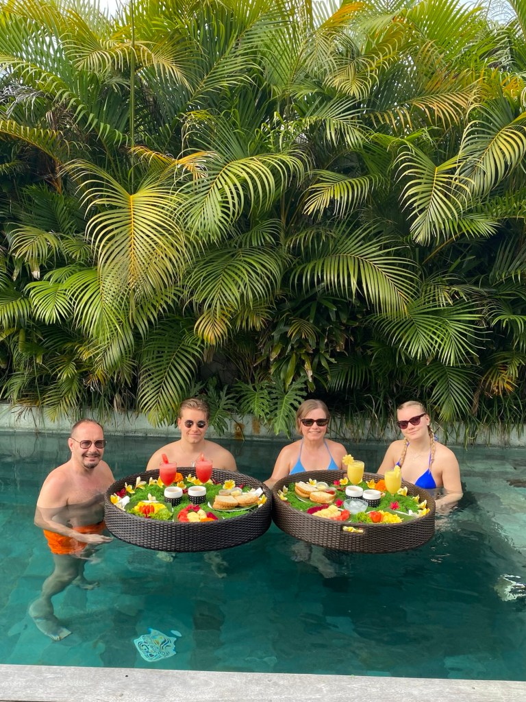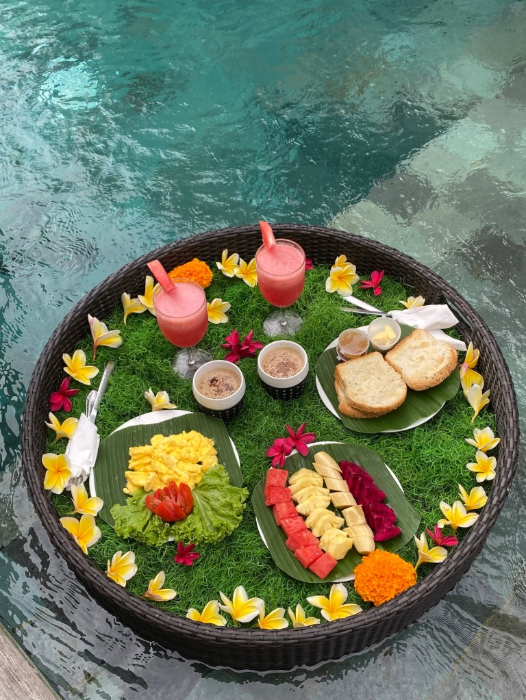Tilattiin yllätyksenä lapsille paikallinen erikoisuus eli kelluva aamiainen oman villan altaalle. Olipa upea kokemus ja miten kaunis kattaus!