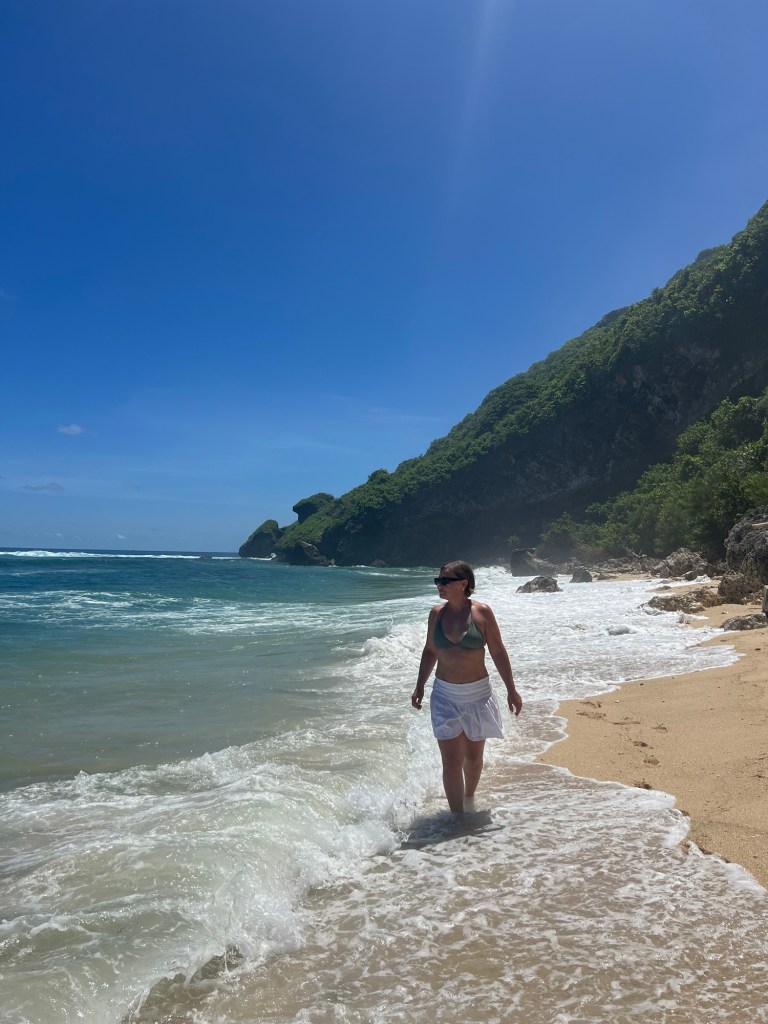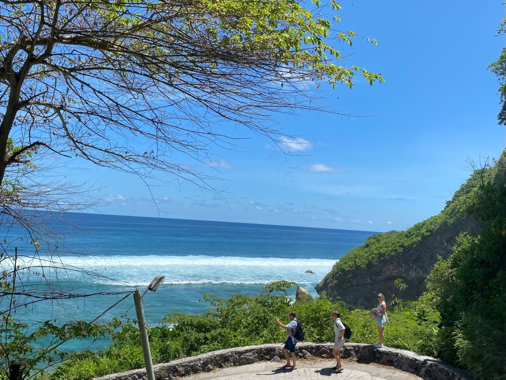Uluwatu on kuuluisa hienoista rannoistaan ja niistä olimme valinneet päivän kohteeksi yhden jonne olisi vähän vaivalloista päästä. Tämä valittiin sen takia että siellä ei olisi turistimassoja. Kyseessä oli Nyang nyang -niminen ranta. Siis apua miten jyrkkä mutta onneksi hyväkulkuinen tie sinne meni! Tämä pitäisi päästä ylöskin vielä. Autolla siitä ei saanut mennä, skootterilla kylläkin.