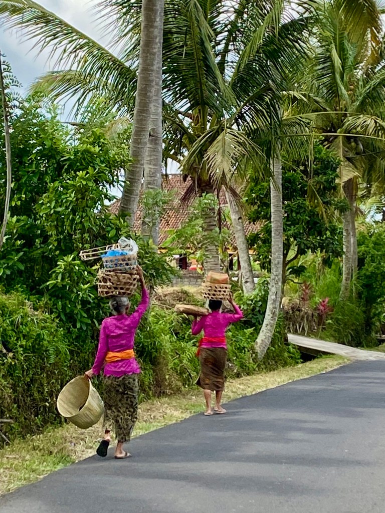 Siitä oli hyvä aloittaa päivä ja rauhassa nautittiin oman villan altaasta ja auringosta. Aamupalan jälkeen lähdettiin tutkailemaan ympäristöä. Olemme melkein maalla, tämä on Tampaksiringin kylä n. 10-15 minuutin päässä Ubudin keskustasta. Paikallisia pääasiassa ja jonkin verran yksityisiä turisteille vuokrattavia asuntoja, muutamia ravintoloita on lähellä. Minea ja Rasmus lähtivät aamupäivällä lyhyelle juoksulenkille ja me Reiman kanssa kävelylle. Kuten kaikkialla täällä, katua pitkin kun kävelee niin heti on temppeli vastassa. Kello taisi olla puolessa päivässä ja lähimmässä temppelissä oli hindujumalien palvontamenot loppumaisillaan. Saimme todistaa kun kylän miehiä, naisia ja perheitä lähtivät sieltä hienoissa asuissaan. Vanhoja uhrilahjoja tuotiin pois sieltä pään päällä.