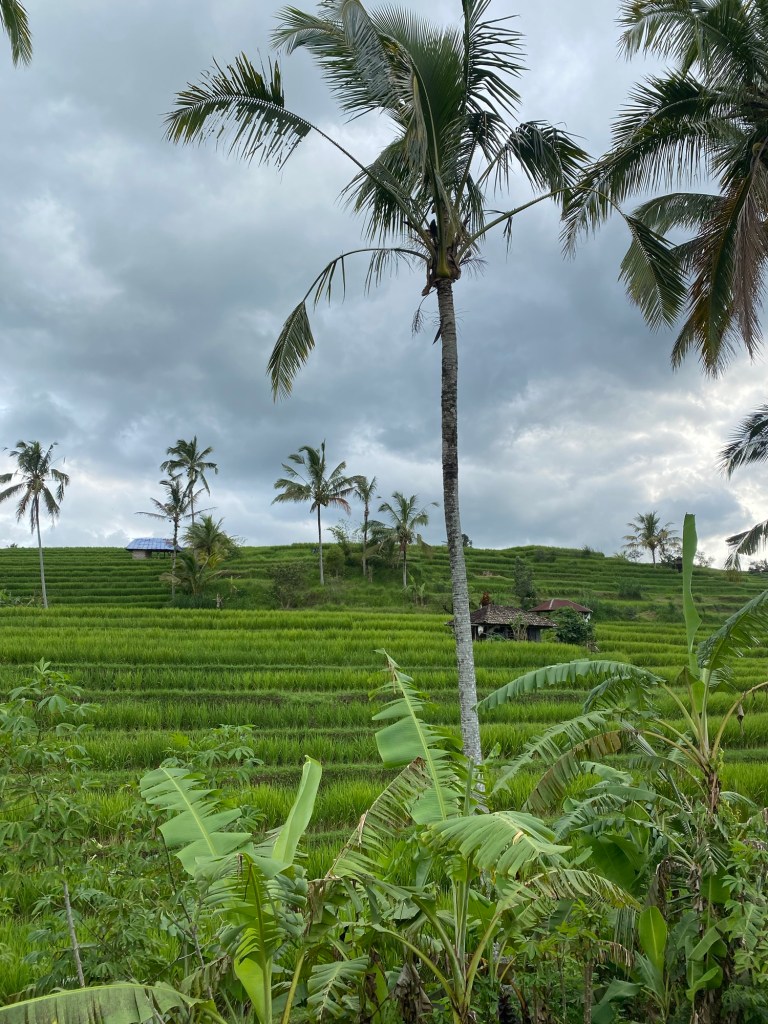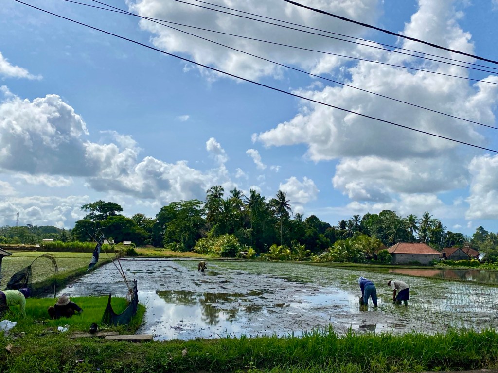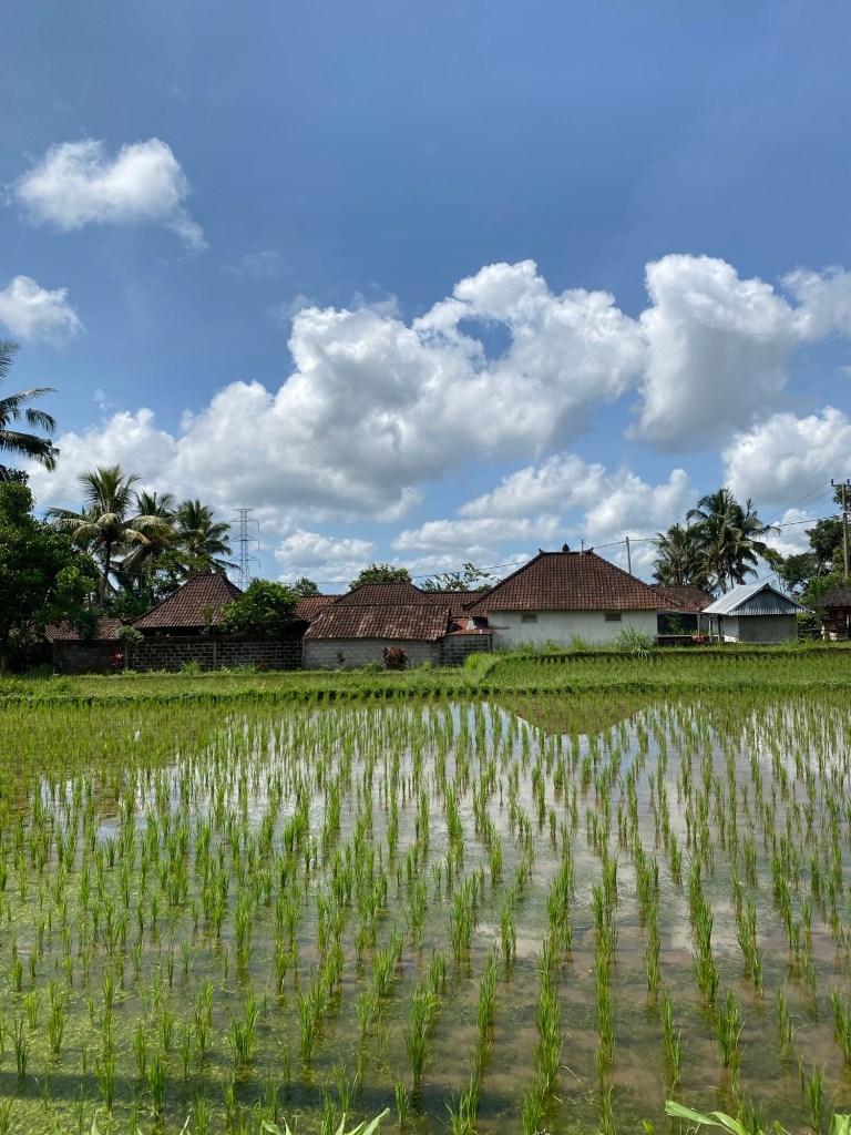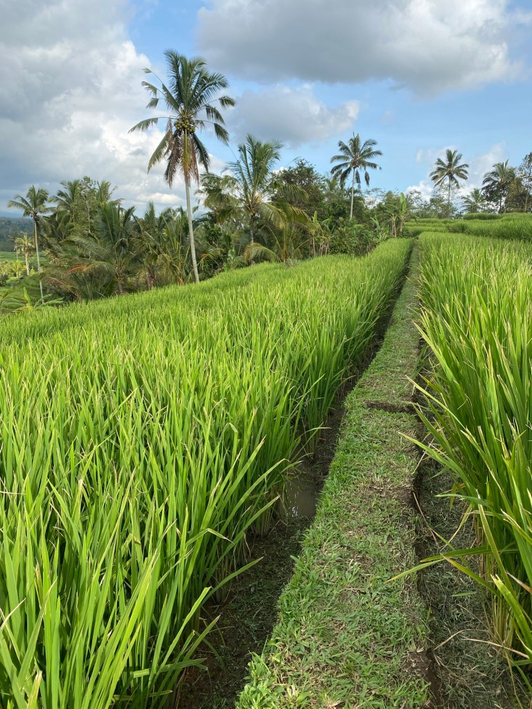 Viimeisenä aamuna Ubudissa käveltiin aamupalalle läheisen hotellin ravintolaan. Se oli keskellä riisipeltoja ja aamun uhraukset hindujumalille olivat siellä juuri käynnissä.