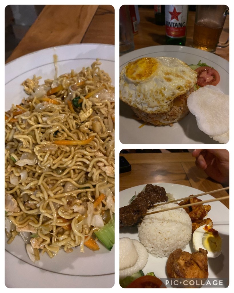 Jotta elämä ei menisi aivan miljonäärihommaksi menimme illalla syömään läheiseen Warungiin. Warung on paikallisten käyttämä hyvin edullinen ravintola. Se oli yksinkertainen, mutta viihtyisä terassi keskellä riisipeltoja ja Rasmus toivoi, että menisimme sinne. Hän aina haluaa mahdollisimman paikallisen ruokakokemuksen. Tilattiin paistettua riisiä ja nuudelia kanalla ja Rasmus jonkin annoksen jonka nimeä en jaksa muistaa. Oli superhyvää, parasta paikallista mitä ollaan täällä saatu. Hinta oli alle 3€ / annos.