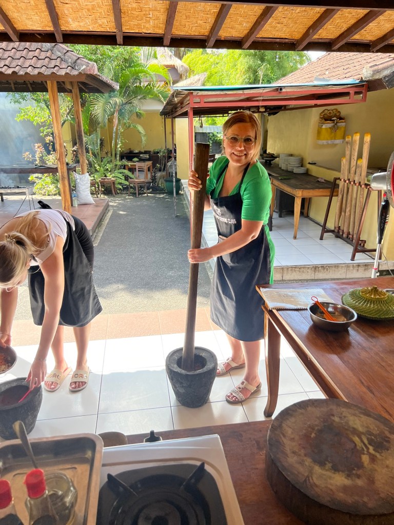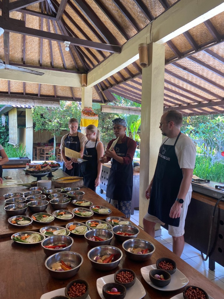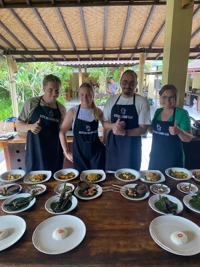 Kyseessä oli Ketut Cooking Classes ja tätä voi suositella. Perheyritys oli kyseessä, isä, äiti ja poika ja veljenpoika. Oli kyllä muutakin avustava henkilökuntaa siellä. Muut osallistujat tulivat Ubudista ja ehdittiin tutustua yhteen nuoreen brittipariskuntaan ja Etelä-Korealaiseen pariskuntaan. Olipa ihme säkä että meidän naapuriin sattui tämmöinen paikka ja hoksattiin mennä sisälle kyselemään.