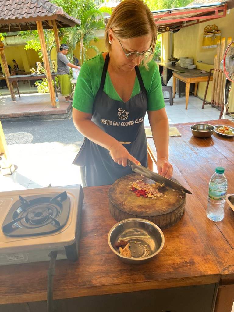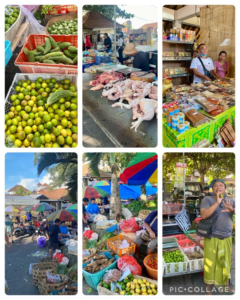 Olimme ekana aamuna kävelyllä bonganneet kyltin balilaisen ruuan kokkauskurssista ja kävelimme sisään kysymään olisiko sellaiselle tilaa. Torstaiaamulle saimme paikat kurssille. Tänään aamulla piti jaksaa herätä kukonlauluun , sillä meitä tultiin hakemaan 7.45 villasta Ubudin keskustaan torille. Sillä tavalla alkoi balilaisen ruuan kokkauskurssi. Opas selosti aineksista joita tulisimme käyttämään. Tämä tori on vain aamuneljästä yhdeksään auki ja sen jälkeen kaikki kerätään pois ja alueesta tulee parkkipaikka.