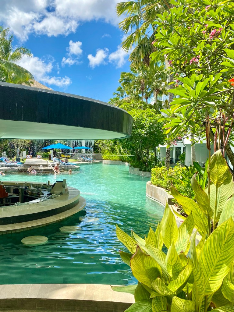 Yleiset tilat olivat hulppeat ja keskellä kivan näköinen allasalue, laguuni kiertää koko sisäpihan. Ubudin jälkeen toki tämä tuntui vähän persoonattomalta paikalta ja turhan länsimaiselta mitä olin vähän pelännytkin. Saimme heti aulassa tervetulojuomat ja tottakai matkatavaramme huolehdittiin huoneeseen.