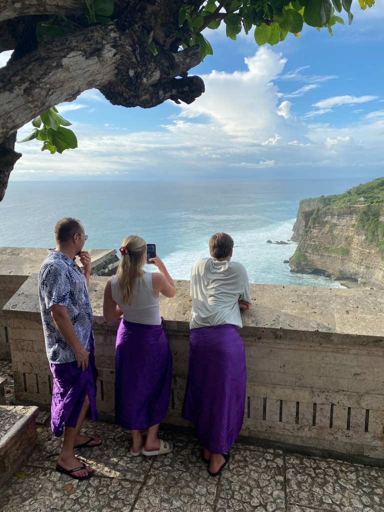 Päivän ohjelmassa oli vielä Uluwatun temppeli ja Kecak -tulitanssinäytös siellä auringon laskiessa. Eipä siinä sitten muuta kuin ihmisten ilmoille takaisin sellaisessa räjähtäneessä lookissa. Itse temppeli oli aika pettymys, sinne ei päässyt kuten ei toki muihinkaan temppeleihin, mutta tämän näki vaan kaukaa. Upea paikka oli muuten, jyrkät vuorenrinteet ja maisemat.