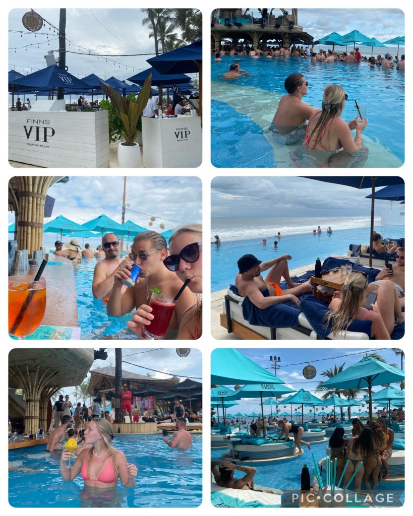 Bali on kuuluisa Beach Clubeista ja maailman parhaaksi itseään mainostaa saaren kuuluisa Finns Club. Paikalla ei ole nimestään huolimatta mitään tekemistä suomalaisten kanssa. Lähdettiin Jimbaranista kympiltä ja olimme ensimmäisten joukossa paikalla Canggun rannalla. Canggu on länsirannikolla ja nykyään suosittu paikka bilettäjille. Kuta ja Seminyak ovat myös suurehkoja paikkoja länsirannikolla ja menomestoja ja muutenkin sellaisia että hylättiin ne heti alussa kuvausten perusteella turhan turistipaikkoina. Ajateltiin että pitäisi kuitenkin päivä Beach Clubilla viettää sillä se on osa balilaista elämystä.