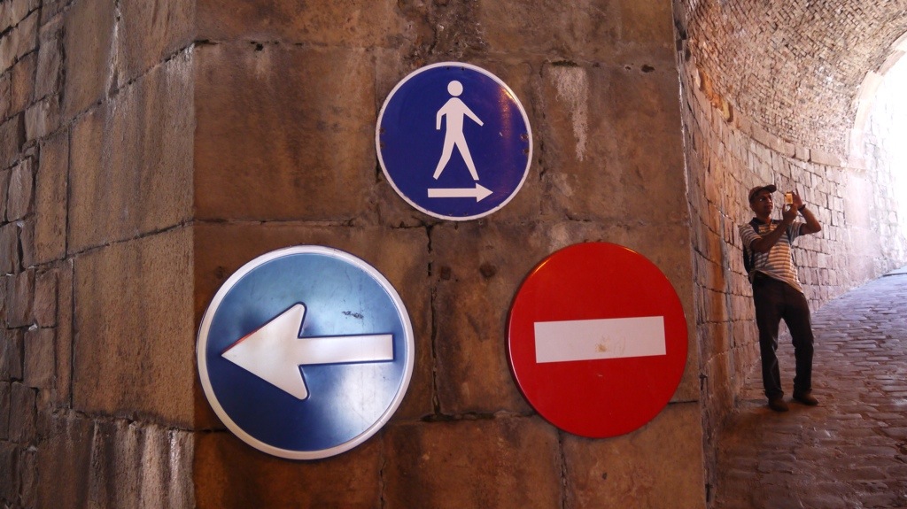 Nämä kyltit hämmensivät turisteja. Käytävällä Mont Juic vuoren linnakkeelle. Siitä pystyi vain kävelemään, nuoli vasemmalle, oikealle kielletty suunta, mutta toisaalta kävelymerkki oikealle, hmmm… 🙂