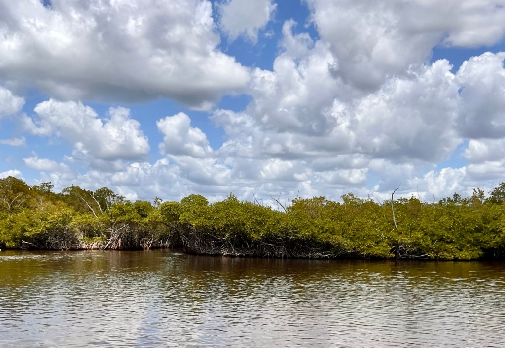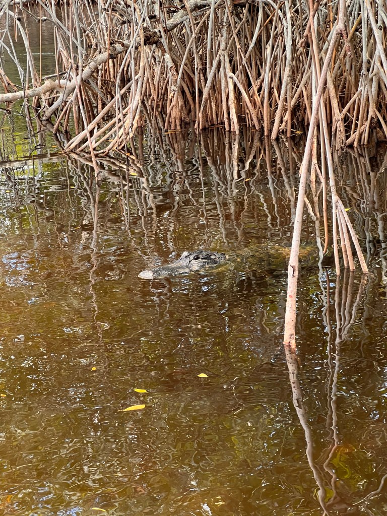 Pysähdyimme isommalle järvelle ja siellä olikin kaksi alligaattoria väijymässä mangrovepuiden suojissa. Ihan lähelle päästiin, liiankin… Kiva kokemus oli kaiken kaikkiaan.
