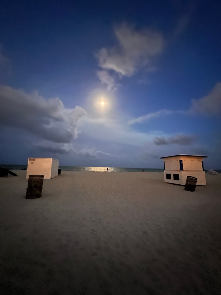 Taksi toi meidät sukkelasti Hotelli Venezian joka on Miami Beachilla. Oi mikä ihana kuumuus! Lähempänä kolmeakymppiä oli lämpötila vaikka ilta oli jo kahdeksan. Kävelimme heti rantaan, kaunista. Tuskin maltan odottaa huomista.