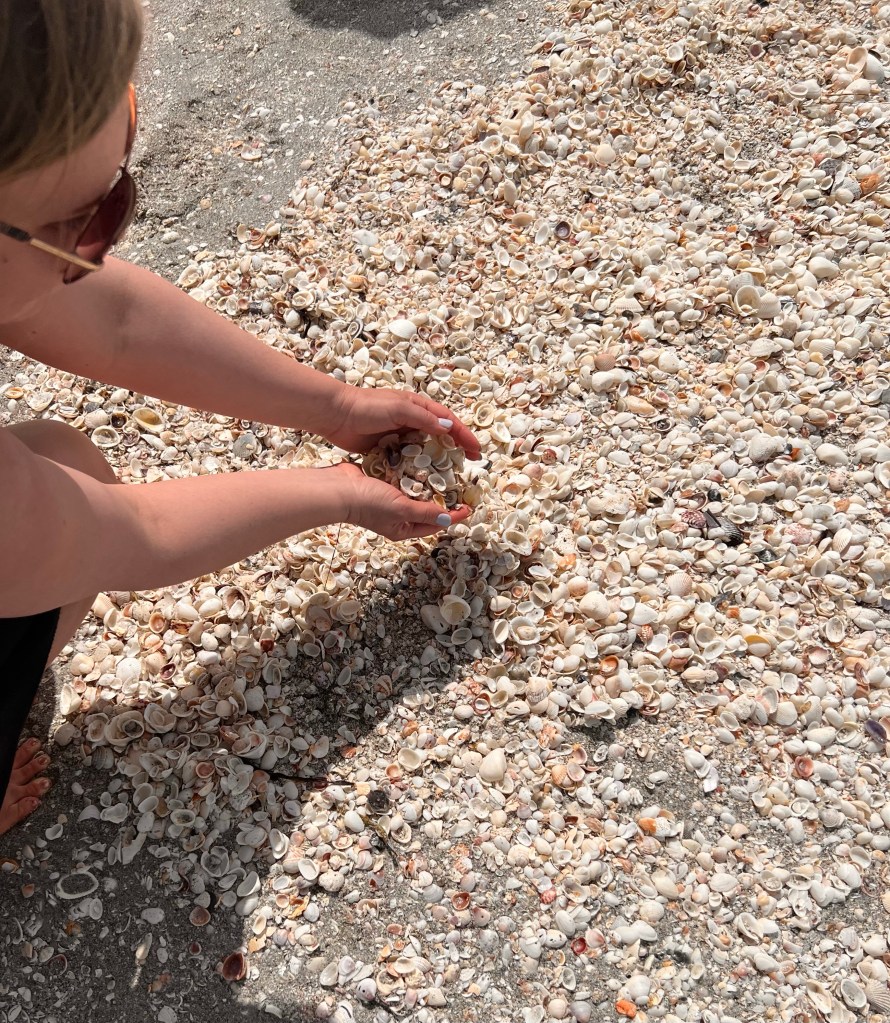 Meillä oli vain yksi yö varattuna hotellissa ja päätimme lähteä käymään vielä saarella jonne näytti menevän hieno silta jonkin matkan päässä. Kyseessä oli Sanibell -niminen saari ja voi mikä yllätys rannalla olikaan. Se oli aivan täynnä simpukoita, siis niin kauniita ja joka paikassa. Rannalla, vedessä, valkoisten lisäksi myös osaksi mustia ja punaisia. Isojakin! Pakkohan niitä oli kerätä vähän matkamuistoksi.
