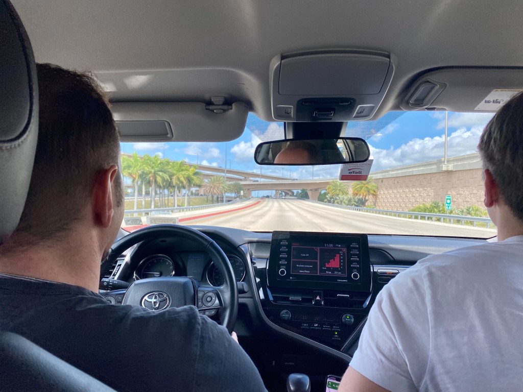 Sitten autolle, joka löytyi ruudusta J801 ongelmitta ja laukut heitettiin takakonttiin. Siihen tulee sitten italialainen 4 henkinen perhe paikalle ja kysyy mikä parkkiruudun numero meillä on. Sanoimme että tämä J801 ja he näyttivät paperia, että niin on heilläkin. Ei voi olla totta! Samasta autosta tehty kahdet paperit. Hetken hämmennys mitä tehdään, me olimme ensin paikalla, mutta tuntui lapselliselta siihen vedota. Ongelma oli yhteinen, näin jo silmissäni sen järkyttävän jonon vuokrauspisteellä ja uudet selvittelyt… Kohteliaasti sanoin valkoisen valheen, että anteeksi aivan kauheasti mutta meillä on jo kova kiire seuraavaan paikkaan. Perheen isä totesikin siihen heti että olitte myös paikalla aikaisemmin. Niin he kääntyivät kannoillaan ja lähtivät päät painoksissa lampsimaan kohti autonvuokrauspaikkaa pari kerrosta ylemmäs. Me kiitettiin hyvää onneamme kahteen kertaan tässä prosessissa ja laitettiin nasta lautaan ja nokka kohti Evergladesin kansallispuistoa.