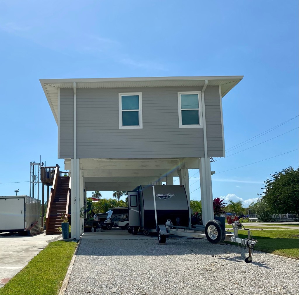 Piipahdimme Evergladesin kaupungissa pikaisesti syömässä ihanan boheemissa kalaravintolassa ja ihmettelimme korkealle pylväiden päälle rakennettuja taloja. Nousuveden haitat hurrikaanien sattuessa ja veden noustessa estetään näin – fiksua.