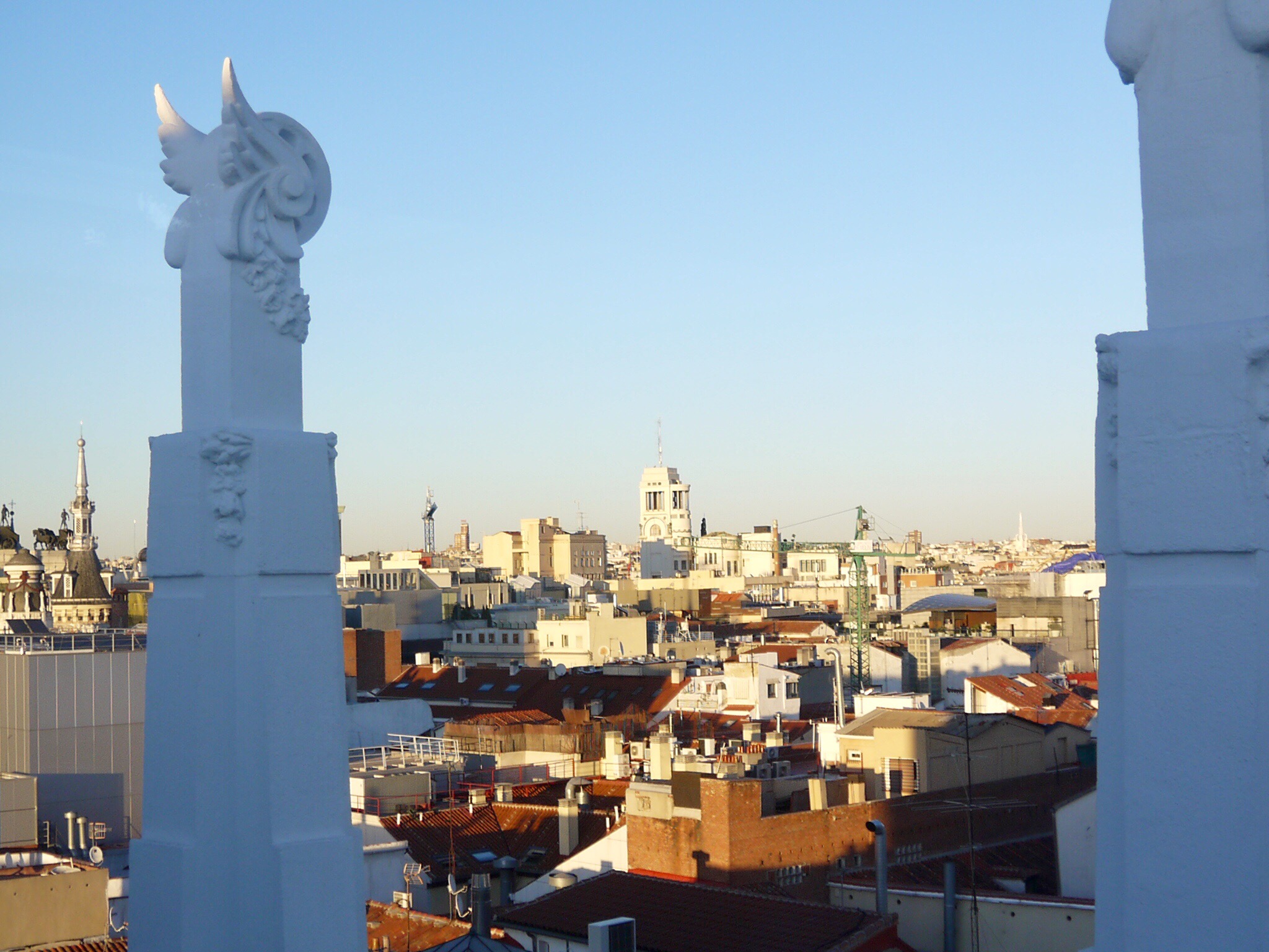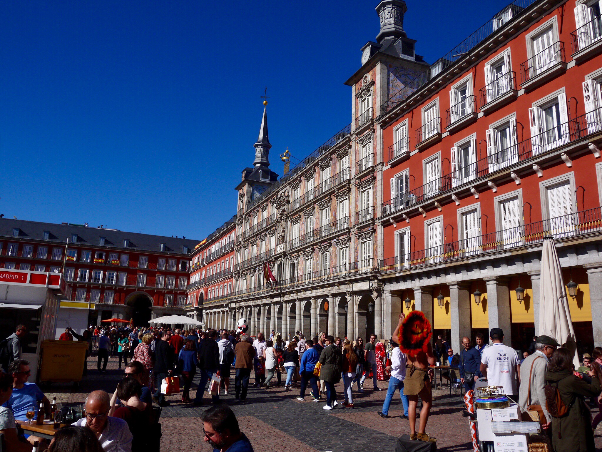 Kun olimme siellä aikamme kierrelleet lähdimme suunnistamaan kohti Retiro-puistoa, sillä se olisi iso ja hieno puisto, jonka laitamilla on monia museoitakin. Ajattelimme, että voisimme vielä piipahtaa jossain museossakin ja sivistää hieman itseämme kaiken huvittelun lisäksi. Kirpparialueelta oli melkein puolen tunnin matka puistoon ja sinnikkäästi sinne päin kävelimmekin, vaikka askeleita olikin taas kertynyt kiitettävästi. Olimme jo melkein perillä, mutta sitten tulikin pissahätä ja nälkä. Yhtäkään ravintolaa ei näkynyt siellä puistoalueella päin, eikä googlemapsikaan ollut meitä viisaampi siinä asiassa. Totesimme, että lähdemme takaisin päin kohti Santa Anan plazaa, sillä siellä saisi ainakin syötävää. Plaza oli aivan täynnä ihmisiä, mutta onnistuimme saamaan pöydän auringosta. Sitten päästiin taas asian ja miniloman ytimeen, cavaa ja tapaksia. Päälle vielä cappucinot ja browniet. Ei pidetty kiirettä, aurinko lämmitti ihanasti ja imimme siitä valoa ja energiaa tulevan talven varalle. Ei siitä enää mihinkään puistoon tai museoon jaksettu lähteä. Kiertelimme ydinkeskustan katuja ja ihmisiä oli kyllä aivan valtavasti liikkeellä sunnuntai-iltanakin. Päädyimme kauppahalliin vielä yöpalalle ja loman kruunasi lasilliset shamppanjaa hyvillä tapaksilla. Äkkiä kello olikin jo kaksitoista ja ajeltiin taksilla hotellille. Aamulla olikin luvassa kauhean aikainen herätys, sillä puoli kuudeksi oli tilattu taksi lentokentälle.