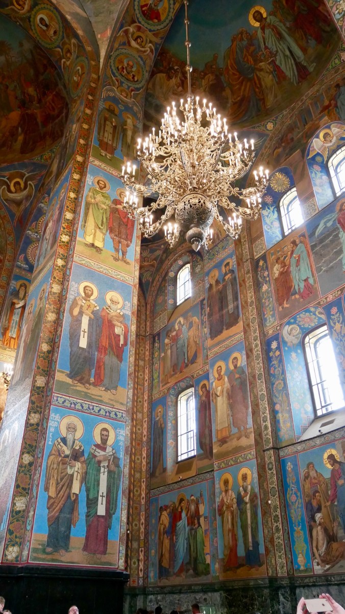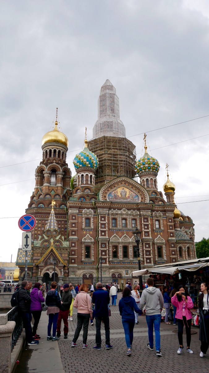 Päätimme lähteä ensimmäiseksi tutustumaan Kristuksen ylösnousemuksen katedraaliin eli Kirkkoon veren päällä. Kirkko on saanut nimensä siitä kun tsaari Aleksanteri II murhattiin siihen paikalle ja kirkko rakennettiin hänen muistokseen. Siellä on matkaoppaskirjasen mukaan pidetty aikanaan vain yksi jumalanpalvelus ja se on toiminut Neuvostoliiton aikana varastona. Herran jestas, komea varasto! Kirkko on avattu 30 vuoden kunnostuksen jälkeen vasta 1997. Pääkupoli oli harmiksemme just remontissa.