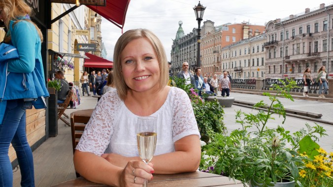 Kaikenlaista hienoa puistoa oli kävelty ja suuta kuivasi jo kovasti. Huonosti oli ollut näkyvissä terasseja, joista matkalaisille saisi sopivaa suun kostuketta. Kiersimme puistoalueelta Miljoonakatua pitkin takaisin Verikirkolle ja pääkadulle Nevski Prospektille päin kävellessä löysimme vihdoin terassin, josta sai kuohuvaa ja olutta! Aurinkokin näyttäytyi sopivasti ja pieni tauko oli tarpeen.
