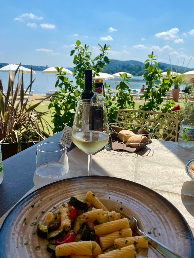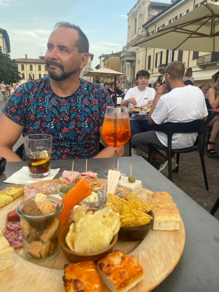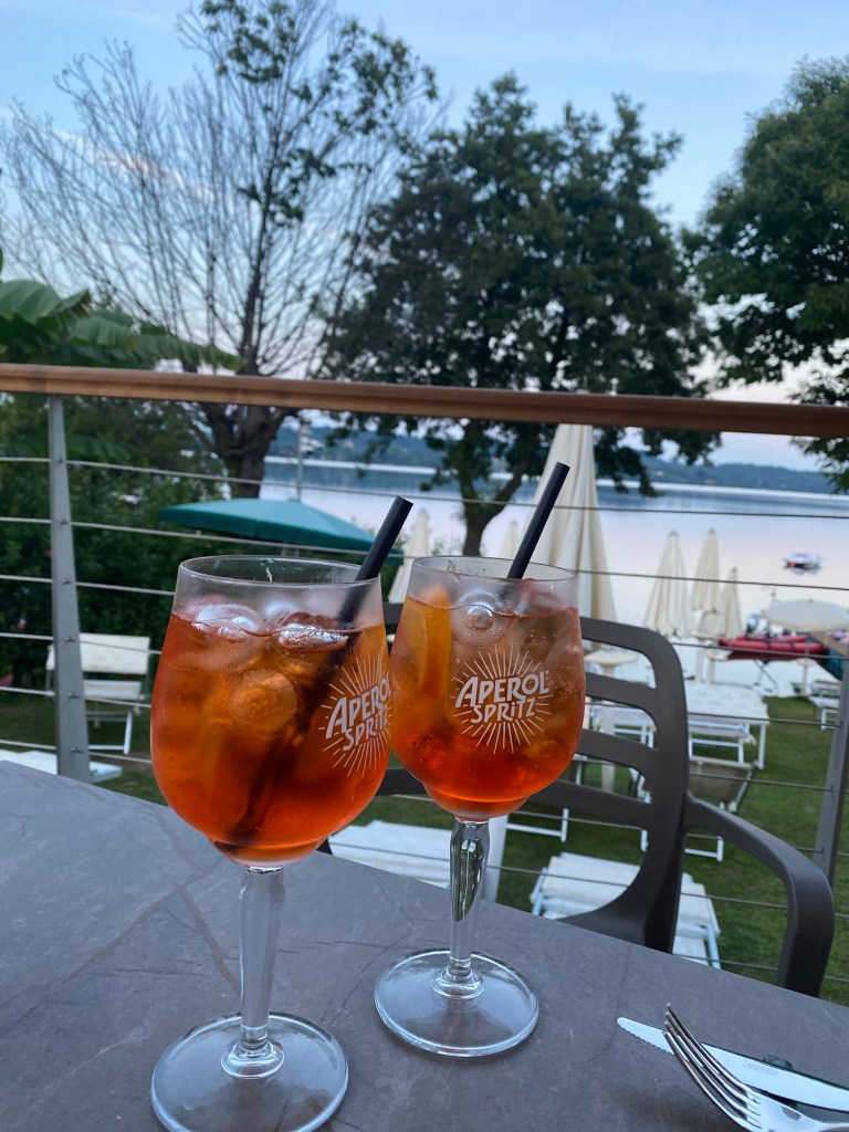 Meillä ei ollut oikein nälkä ja päädyttiin rantaravintolaan vaan juomille. Siellä sai maksamalla juoman lisäksi 2€:n lisähinnan pientä aperitivoa. Se vaikutti sopivalta tähän iltaan. Syötävää tuli itse asiassa tosi paljon.