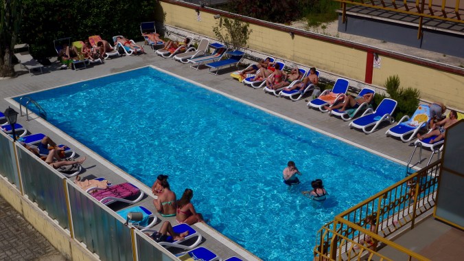 Viimeisen yön hotellin varaaminen oli jäänyt vähän viime tinkaan, vasta pari viikkoa sitten varasin sen. Hinnat olivat tietenkin aika korkeat ja 135€:n hintaan saimme pienen huoneen neljälle Roma Terminin läheltä. Ajattelimme siinä vaiheessa, että junalla varmaan kannattaa aamulla mennä lentokentälle ja olisimme siinä kätevästi lähellä rautatieasemaa. Ei ilmastointia saanut siihen hintaan. Huoneet ilmastoinnilla olivat monta sataa euroa ja nuukuus iski siinä vaiheessa. Yksi yö nyt menee vaikka missä! Ihan hyvät arvotelut oli tämä Hotel Giorgina saanut booking.comissa ja siksi sen uskalsin varata. Kun auto vuokrattiin ja haettiin se aseman lähellä olevasta parkkihallista, niin heti olikin selvää, että siinä oli vähän erilainen Rooma läsnä. Oli melkoisen epämääräisen näköistä kulkijaa, talojen seinät spreiattuja ja muutenkin huonomman näköistä seutua. Edellisiltana katsoin sitten, että Hotel Giorgina on vain parin korttelin päässä Roma Terministä ja aloin pelkäämään, että ollaan siellä aivan epämääräisillä huudeilla. Pahalta se vähän näyttikin, mutta ei hätää! Tämä olikin Roma Terminin alkupään kortteleita ja tämä seutu on ihan siistiä. Huone oli myös ok, mutta lämpötila ulkona oli 34 kun tänne saavuttiin eli sisälläkin sitä lämpöä riitti.