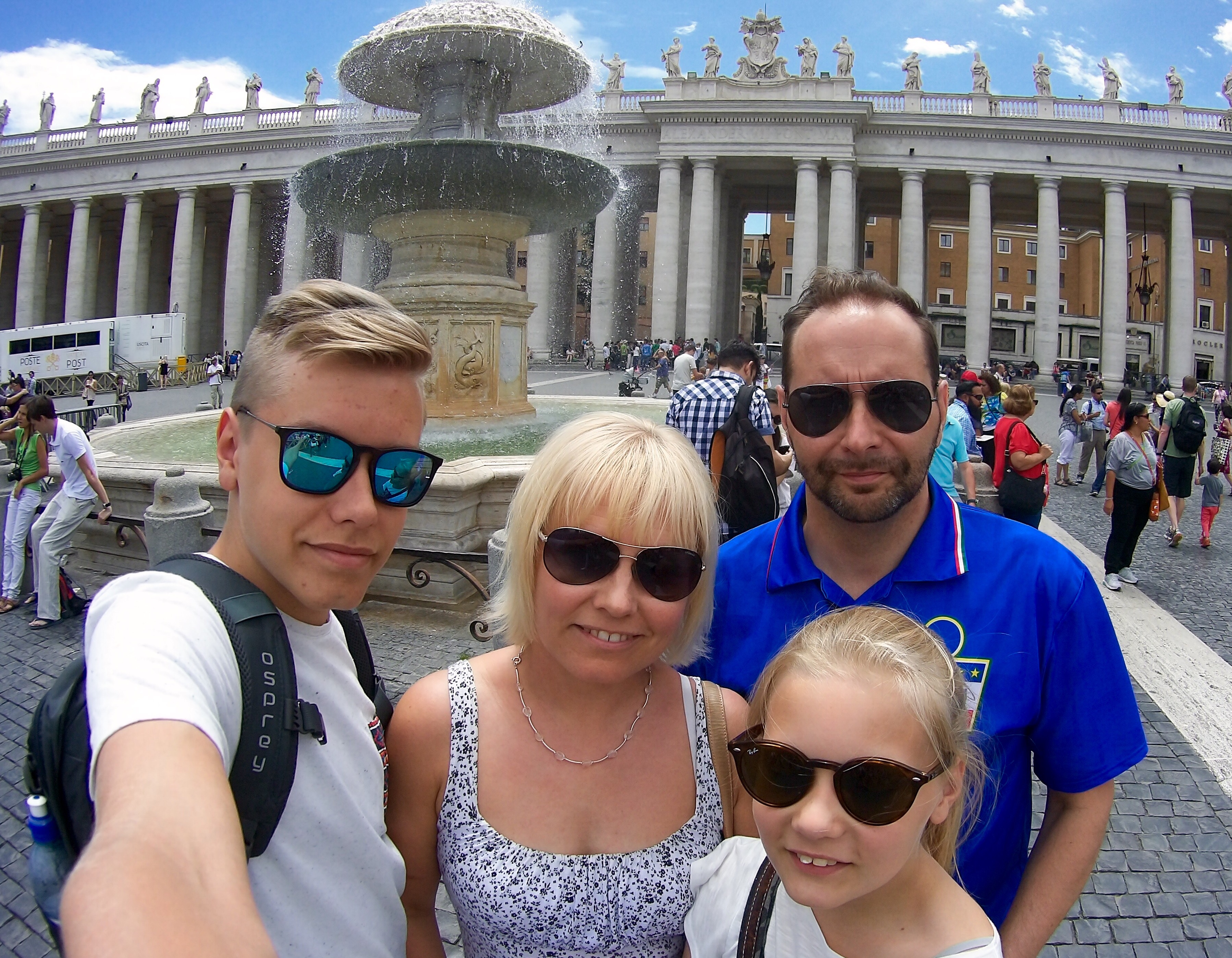 Viimeisen yön hotellin varaaminen oli jäänyt vähän viime tinkaan, vasta pari viikkoa sitten varasin sen. Hinnat olivat tietenkin aika korkeat ja 135€:n hintaan saimme pienen huoneen neljälle Roma Terminin läheltä. Ajattelimme siinä vaiheessa, että junalla varmaan kannattaa aamulla mennä lentokentälle ja olisimme siinä kätevästi lähellä rautatieasemaa. Ei ilmastointia saanut siihen hintaan. Huoneet ilmastoinnilla olivat monta sataa euroa ja nuukuus iski siinä vaiheessa. Yksi yö nyt menee vaikka missä! Ihan hyvät arvotelut oli tämä Hotel Giorgina saanut booking.comissa ja siksi sen uskalsin varata. Kun auto vuokrattiin ja haettiin se aseman lähellä olevasta parkkihallista, niin heti olikin selvää, että siinä oli vähän erilainen Rooma läsnä. Oli melkoisen epämääräisen näköistä kulkijaa, talojen seinät spreiattuja ja muutenkin huonomman näköistä seutua. Edellisiltana katsoin sitten, että Hotel Giorgina on vain parin korttelin päässä Roma Terministä ja aloin pelkäämään, että ollaan siellä aivan epämääräisillä huudeilla. Pahalta se vähän näyttikin, mutta ei hätää! Tämä olikin Roma Terminin alkupään kortteleita ja tämä seutu on ihan siistiä. Huone oli myös ok, mutta lämpötila ulkona oli 34 kun tänne saavuttiin eli sisälläkin sitä lämpöä riitti.