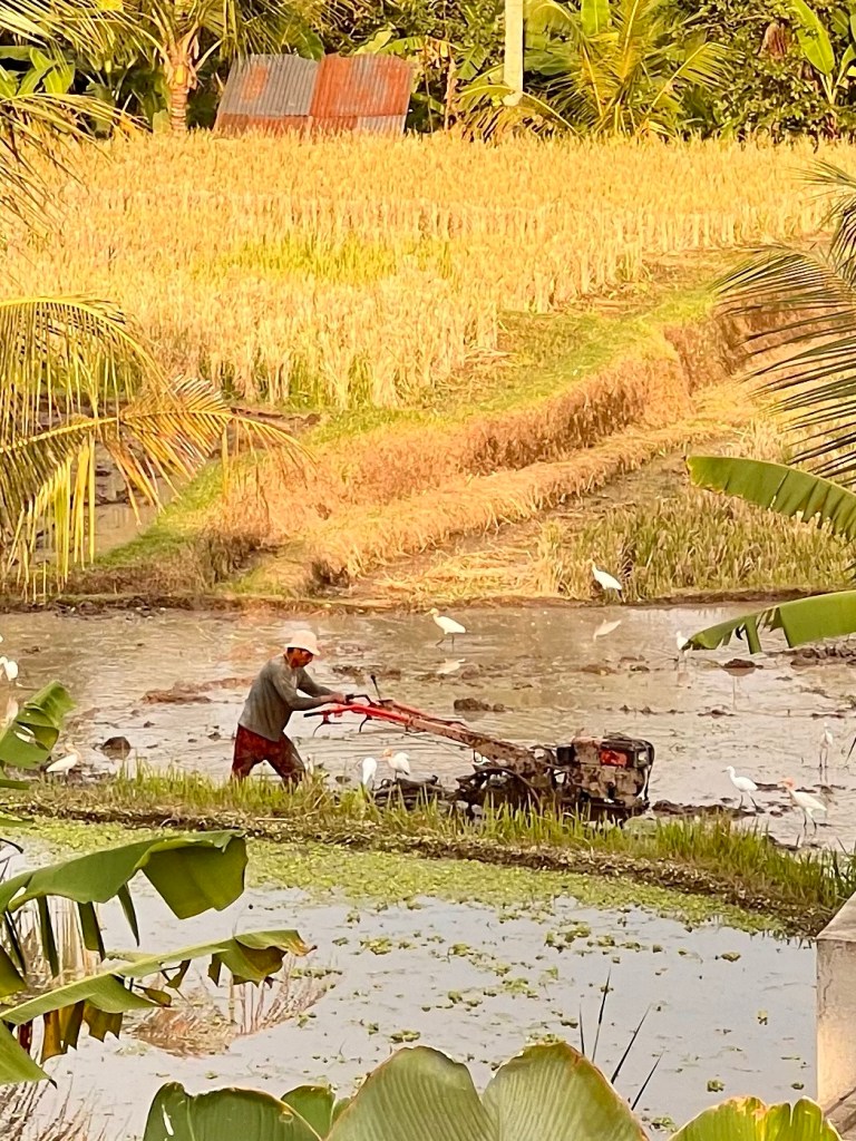 Nyt olemme noin 15-20 minuutin matkan päässä Ubudin keskustassa, tässä edessä on viidakkomaiseman lisäksi riisipeltoja ja maanviljelijä työssään. On tuossa hommaa, noin pieni kone ja valtava pelto. Odottelemme lapsia saapuvaksi kentältä, ihanaa saada heidät tänne.