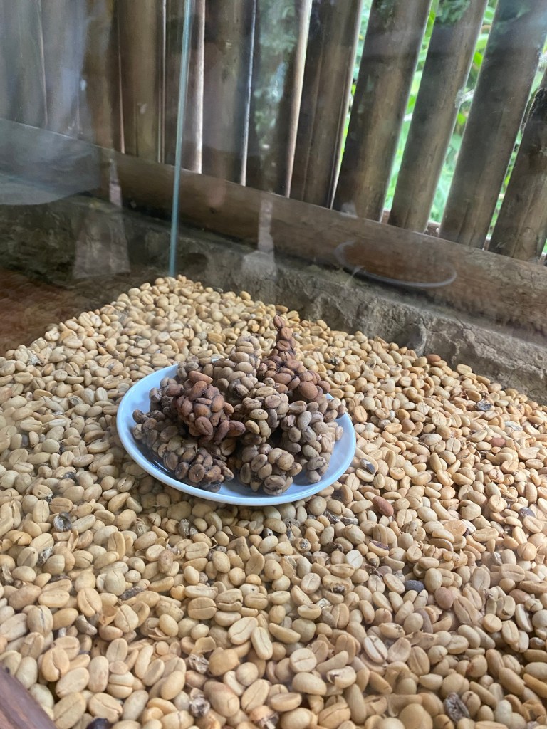 Meille esiteltiin siellä mitä kaikkea plantaasilla kasvaa, kahvin lisäksi vaniljaa, pippuria, kanelia ja inkivääriä ainakin. Tässä sitä sivettikissan kakkaa jossa pavut ovat: